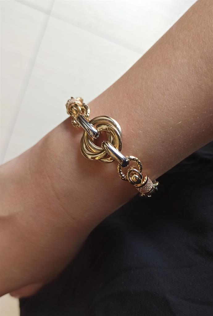 Υπέροχο γυναικείο βραχιόλι τρίχρωμο χρυσό 14 καρατίων. Είναι διακοσμημένο με λευκές πέτρες ζιργκόν. Είναι ιταλικής κατασκευής με κρίκους Κομψό , διαχρονικό κόσμημα που θα μαγνητίσει τα βλέμματα!