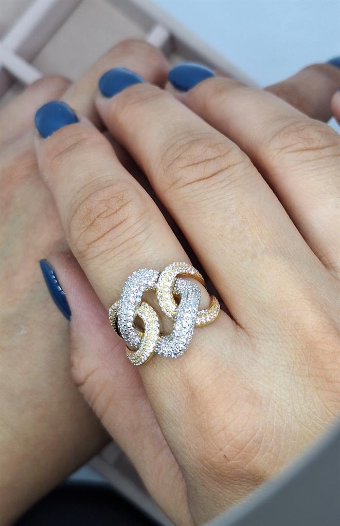 Εντυπωσιακό γυναικείο δαχτυλίδι από χρυσό και λευκόχρυσο 14 καρατίων με λευκές πέτρες ζιργκόν σε σχεδιασμό chain. Κόσμημα που δεν πρέπει να λείπει από τη συλλογή σου!