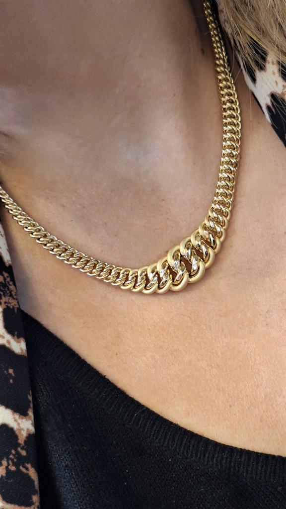 Με συνδυασμό ματ και λουστρέ χρυσού 14 καρατίων αυτό το εντυπωσιακό κολιέ δεν πρέπει να λείπει από τη συλλογή σου. Εντυπωσιακό, κομψό, ιταλικής κατασκευής, ακόμη πιο ξεχωριστό με την ιδιαίτερη πλέξη και την εναλλαγή ματ λουστρέ στο κάτω μέρος του κολι΄΄ε, Συνδύασε το με το ίδιο βραχιόλι και δημιούργησε τις πιο elegant εμφανίσεις!