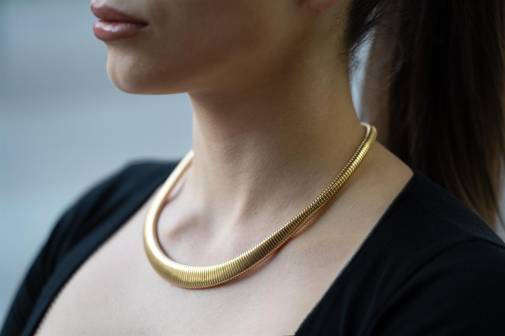 Κολιέ κατασκευασμένο από κίτρινο χρυσό 14 καρατίων. Η αλυσίδα αυτή είναι φαρδιά, ντεγκραντέ, στρογγυλεμένη εύκαμπτη, με συμπαγή, ενιαία πλέξη και αγκαλιάζει υπέροχα το λαιμό. Υπέροχο κόσμημα για τον λαιμό σας. Ιδανικά συνδύασε το με το ίδιο βραχιόλι.