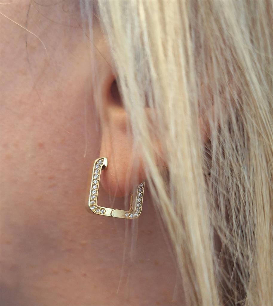 Μοντέρνα σκουλαρίκια από χρυσό 14 καρατίων σε τετράγωνο σχήμα με χωνευτές πέτρες ζιργκόν στο πλάι και σκέτο λουστρέ σχέδιο απο μπροστά. Minimal, ιδιαίτερα, τις καθημερινες σου εμφανίσεις!
