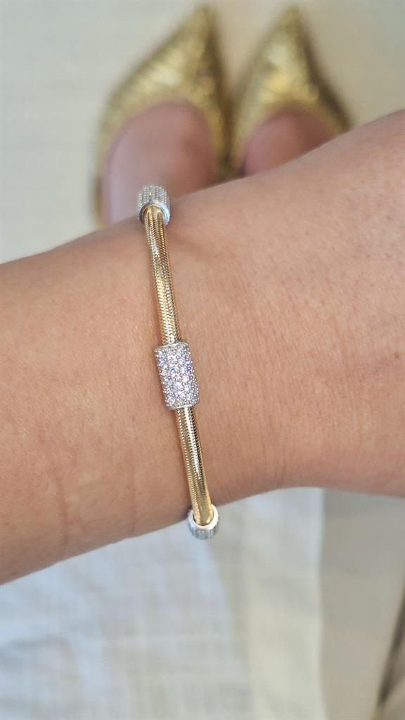 Κομψό και ευέλικτο βραχιόλι από χρυσό 14 καρατίων με διακριτικά λαμπερά στοιχεία από λευκές πέτρες. Το flexible design προσφέρει άνεση και εφαρμογή στον καρπό, ενώ η διχρωμία του σχεδίου το καθιστά ιδανικό για κάθε εμφάνιση. Συνδυάζεται άψογα με το αντίστοιχο κολιέ για ένα πλήρες σετ κοσμημάτων που ξεχωρίζει.