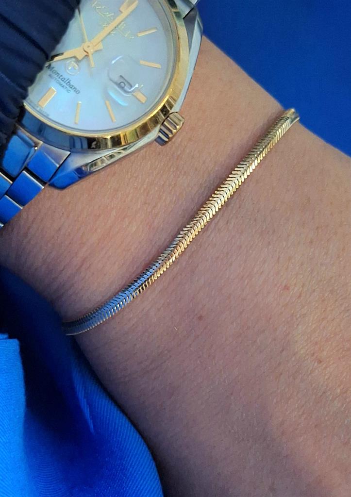 Αυτό το βραχιόλι από χρυσό Κ14 με σχέδιο αλυσίδας τύπου "φίδι" (snake chain) προσθέτει διακριτική λάμψη και κομψότητα σε κάθε σας εμφάνιση. Ιδανικό για καθημερινή χρήση αλλά και για πιο ιδιαίτερες περιστάσεις. Φοριέται μόνο του ή σε συνδυασμό με την αντίστοιχη αλυσίδα λαιμού για ένα εντυπωσιακό σετ. Συνδυάζεται υπέροχα με την αντίστοιχη χρυσή αλυσίδα λαιμού για ένα πλήρες σετ.
